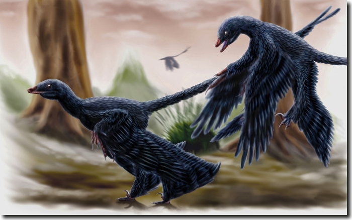 Abb. 1: Ein rekonstruiertes und künstlerisch dargestelltes Paar von Microraptor gui (Dromaeosauridae, Microraptorinae). (durbed.deviantart.com, CC BY-SA 3.0)