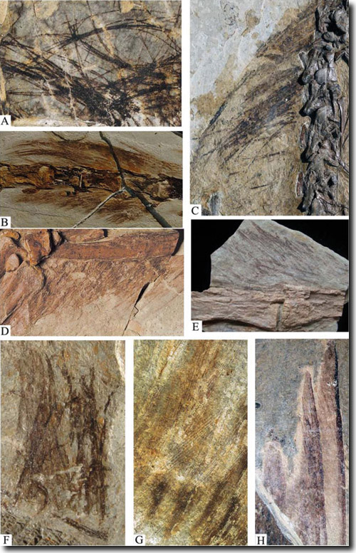 Abb. 2: Einige sogenannte „Nicht-Vogel-Dinosaurier“-Gattungen mit filamentösen Integumentstrukturen: A Tianyulong, B Sinosauropteryx; C, D Beipiaosaurus, E Dilong, F Sinornithosaurus, G Caudipteryx, H Microraptor. Bei den letzten beiden Gattungen sind außerdem auch Konturfedern nachgewiesen. Aus Xu & Guo (2009), mit freundlicher Genehmingung.