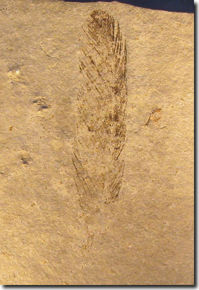 Abb. 3: Die 1860 in den Solnhofener Plattenkalken gefundene Feder (mutmaßlich von Archaeopteryx) ist knapp 6 cm lang, etwa 1 cm breit und besitzt eine betont asymmetrische Fahne, sie „ist in ihrem Aufbau von rezenten Vogelfedern nicht zu unterscheiden“ (Kremer et al. 2000, 323). (Bild: H. Raab, CC BY-SA 3.0)
