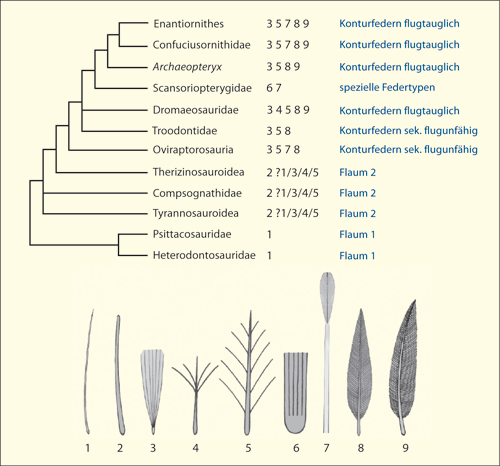 Auf den ersten Blick passt das Cladogramm sehr gut zu einer wachsenden Komplizierung der Federn. Eine genauere Analyse zeigt jedoch, dass es eine deutliche Trennung zwischen Flaum und echten Federn gibt, insbesondere wenn die Unsicherheiten bei den Therizinosauroidea (Beipiaosaurus), Compsognathidae (Sinosauropteryx) und Tyrannosauroidea (Dilong, Yutyrannus) in Rechnung gestellt werden („?“ in der linken Spalte).14 Nach den in der Fachliteratur vorliegenden Beschreibungen sind bei den betreffenden Gattungen nur filamentöse Integumentstrukturen nachgewiesen.