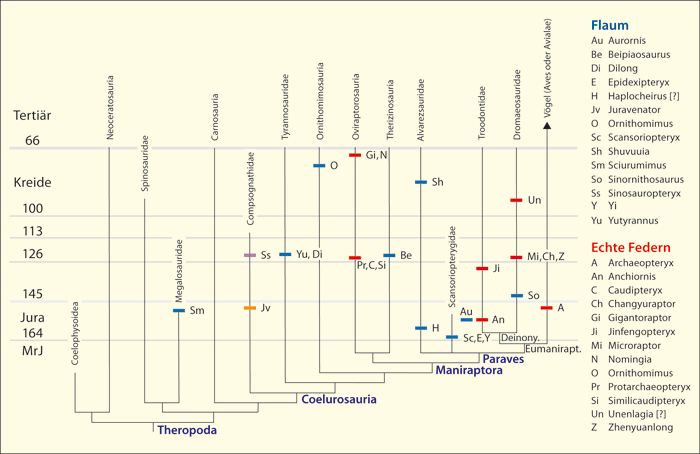 Abb. 6 zeigt ein aktuelles Cladogramm, in dem auch die stratigraphischen Positionen der „Nicht-Vogel-Dinosaurier“-Gattungen und von Archaeopteryx berücksichtigt sind. In dieser Darstellung wird deutlich, dass die Gattungen mit Dino-Flaum systematisch weit verteilt sind, wobei Abb. 6 nur Theropoden-Dinosaurier beinhaltet. Es kommen wie oben dargestellt weitere Gattungen aus dem Ornithischia hinzu. Dazu kommen in der Unterkreide noch zahlreiche weitere Gattungen mit voll ausgebildeten Federn wie Jeholornis, Sapeornis und die großen Gruppen der Enantiornithes („Gegenvögel“) und Ornithurae („Vogelschwänze“).