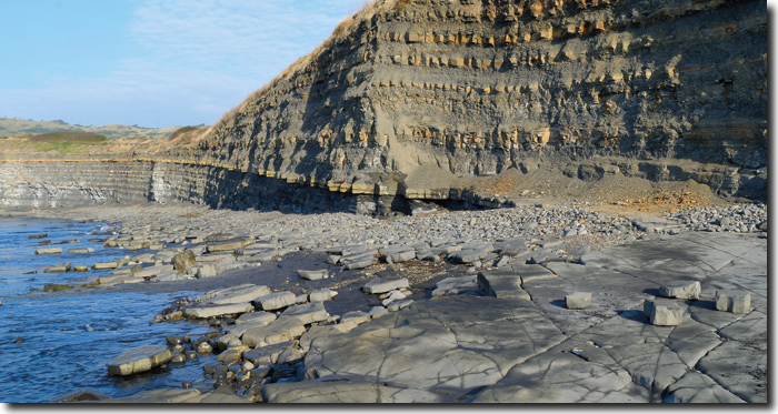 Abb. 1: Kimmeridge Bay (Südengland) bei Kimmeridge, Ausschnitt des Westteils der Bucht. Der Küstenaufschluss ist die traditionelle Typus-Lokalität der Tonsteinfolge der Kimmeridge-Clay-Formation (Oberjura). Die dominanten, im verwitterten Zustand bräunlichen Bänke sind karbonatische Lagen. Die Schichten fallen leicht nach Osten ein; im Vordergrund die prominente „Washing Ledge“-Dolomitbank. Die Fossilien des Kimmeridge Clay sind teilweise exzellent erhalten (s. Abb. und Kasten 2). (Foto: M. Kotulla, 2016)