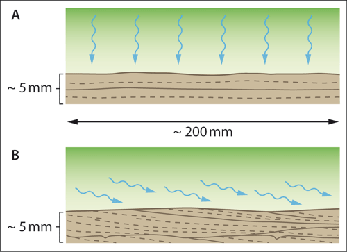 Abb. 2: Mechanismen der Tonablagerung (schematisch). A Absatz aus Trübe (Suspension), Niederschlag einzelner Partikel (wellige, vertikale Pfeile); vorherrschende Vorstellung. B Ablagerung in Form von Aggregaten durch Bodenströmung, wie durch Experimente identifiziert (wellige, nahezu horizontale Pfeile). – Sediment: durchgezogene Linien, Schichtflächen: gestrichelte Linien, Laminen(flächen). (Nach Macquaker & Bohacs (2007), ihre Abb. auf Seite 1734. Grafik: F. Meyer)