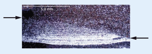 Abb. 3: Dünnschliff-Scan eines Tonsteins der Kimmeridge-Clay-Formation, senkrecht zur Schichtung. Die Probe besteht aus Komponenten der Silt- und Tonfraktion und enthält eine Rippel (Oberfläche durch schwarze Pfeile markiert). Die Rippel zeigt an, dass das Sediment durch Bodenströmungen abgelagert wurde und nicht durch einen Niederschlag aus Suspension (vgl. Abb. 2). (Aus Macquaker & Bohacs (2007), ihre Abb. auf Seite 1735 der Science-Ausgabe vom 14. Dez. 2007; Abdruck mit Genehmigung von AAAS. Pfeile und Rahmen sind Ergänzungen des Verfassers)