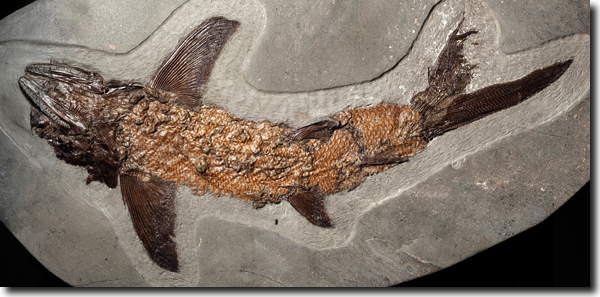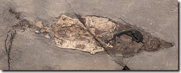 Abb. 4: Knochenfisch Caturus sp., Aufsicht auf Bauchseite (von der Unterseite präpariert). Exzellente Erhaltung (s. Flossen und Schuppen). Kimmeridge Clay, Fundjahr 2013 (Fundstück K2059). (© The Etches Collection, Foto: Terry Keenan, freundl. Zurverfügungstellung)