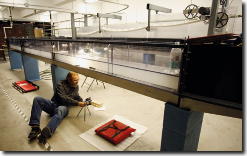 Abb. 5: Labor der Indiana University (USA) mit einer Umlauf-Gerinneanlage, Stand 2007. Auf dem Boden Prof. Juergen Schieber. (Foto/Credit: Indiana University, freundl. Zurverfügungstellung)
