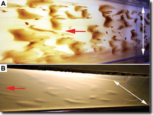 Abb. 6: Visualisierung von Flocken-Rippeln im Gerinne-Kanal. A Blick von unten (Breite 25 cm, weißer Doppelpfeil), mit Durchlicht von oben. Die Migration erfolgt von rechts nach links (roter Pfeil). B Schrägsicht von oben mit Seitenlicht (dasselbe Experiment wie A). Die Rippeln sind mit einer dünnen Haut von residualem Ton der Suspension drapiert, nachdem der Strom angehalten wurde (roter Pfeil zeigt Strömungsrichtung an). Nachdruck von Fig. 1 aus Schieber & Yawar (2009) in The Sedimentary Record (CC BY-NC 4.0).