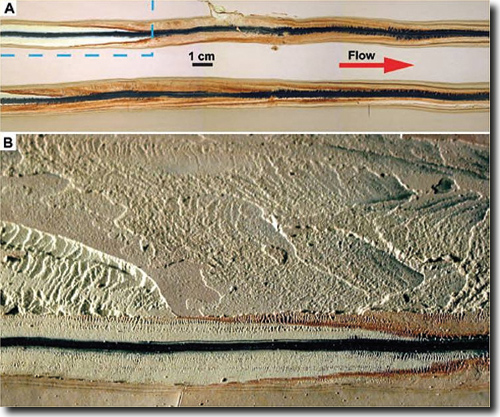 Abb. 7: Laterale Akkretion, visualisiert durch eingestreute Farbpigmente. Freilegung der Internstruktur des produzierten Sediments durch Ausschälung parallel zur Fließrichtung; Blick von oben. A Die Pigmentmarker verdeutlichen geneigte, nach rechts einfallende Laminen (Schrägschichtungsbögen). Die Anlagerung erfolgte von links nach rechts (roter Pfeil markiert Fließrichtung). B Ausschnitt von A (blaue Markierung). Zwei Sets interner Schrägschichtung: ein unterer Teil mit weißem Ton (Material) und ein oberer rötlicher Teil, der mit dem Pigmentmarker einsetzt. Die Struktur ist identisch mit der Rippen- und Furchenstruktur („rib and furrow“), die von Rippel-schräggeschichteten sandigen Ablagerungen beschrieben wird (siehe auch Strukturen auf Sedimentoberfläche). Nachdruck von Fig. 3 aus Schieber & Yawar (2009) in The Sedimentary Record (CC BY-NC 4.0).