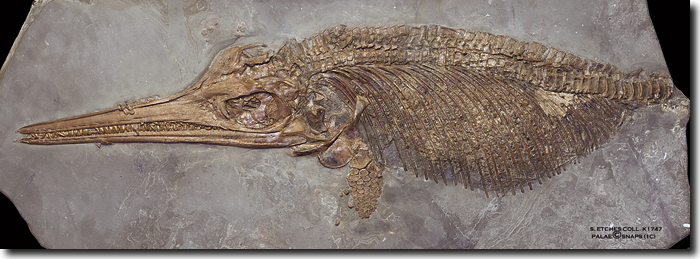 Abb. 9: Ichthyosaurier mit vollem Bauch. Vollständiger Schädel und Körper; möglicherweise eine neue Spezies. Im Bereich des Rippenkorbs Überreste von Fischen und Tintenfischen. Kimmeridge Clay, Fundjahr 2007 (Fundstück K1747). (© The Etches Collection, Foto: Terry Keenan, freundl. Zurverfügungstellung)