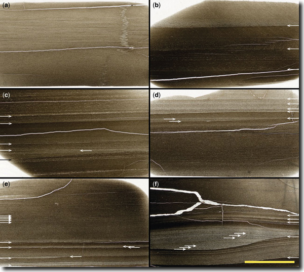 Abb. 12: Dünnschliff-Scans der „Jet Rock-Tonsteine“ (Port Mulgrave, Yorkshire, England; Unterjura). Maßstab entspricht 1 cm. Die Pfeile deuten auf Gefügemerkmale wie scharfe Schichtuntergrenzen sowie dünne Siltlagen (hellere Feinlaminen). Sie zeigen Ablagerung und Erosion durch Bodenströmungen an. Die Beobachtung und Erkenntnis ist nicht neu: Bereits Sorby (1908) hatte die laminare Struktur dieser Tonsteine der Wirkung von Strömungen zugeschrieben. (Aus: Trabucho-Alexandre (2015), seine Fig. 6; freundliche Freistellung, http://creativecommons.org/licenses/by/3.0)