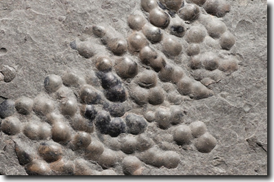 Abb. 13: Cluster kugelförmiger Objekte, als Ammoniten-Eier interpretiert (Etches et al. 2009). Fundstück K1654, Durchmesser der Objekte 1,0 bis 2,3 mm. Kimmeridge Clay. (© The Etches Collection, Foto: Terry Keenan, freundl. Zurverfügungstellung)