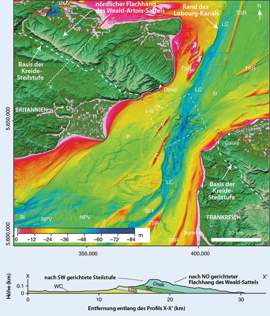 Abb. 2: Karte und Profil. Oben: Bathymetrische Karte des NO-Teils des Ärmelkanals; koloriert und schattiert. C, V, TSR, diverse Sandrücken; LC, Lobourg Channel (Lobourg-Kanal); NPV, Northern Palaeovalley (nördliches Paläotal); P, platform (Plattform); SI, streamlined island (stromlinienförmige Insel); X-X‘, Profillinie. Unten: Geologisches Profil X-X‘ entlang der Nordflanke des sog. Wealdon-Sattels. Sedimentfolge des britischen Kreide-Systems: WC, Weald Clay; LGS, Lower Greensand; GC, Gault Clay; Chalk (Kreide-Formationen, undifferenziert). Es wird angenommen, dass die Steilstufe aus Kreidegesteinen den ehemaligen Rücken der Landbrücke über der heutigen Straße von Dover bildete (Fortsetzung in Frankreich!). Abbildungen aus Gupta et al. (2017), ihre Fig. 4 (teilweise in Übersetzung). (CC BY 4.0)