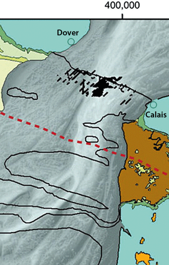 Erst kürzlich waren weitere Megaflut-Phänomene im Ärmelkanal von Collier et al. (2015) untersucht worden, insbesondere Strom-geformte, stromlinienförmige Inseln. In der neuen Arbeit nun präsentieren Gupta et al. (2017) direkte Indizien für die Existenz der Landbrücke. Sie beschreiben Strukturen im Lobourg-Kanal in der Straße von Dover (Abb. 2), die auf neuen Sonardaten zur Seebodenvermessung (Bathymetrie) sowie hochauflösenden See-seismischen Profilen des Untergrundes basieren.