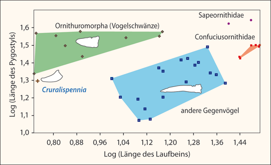 Abb. 1: Form von Pygostylen von Vögeln aus dem geologischen System der Kreide, dargestellt im Verhältnis von Pygostyl-Länge zur Länge des Laufbeins (Tarsometatarsus). Crualispennia gehört zwar zu den Gegenvögeln; die Form seines Pygostyls tendiert eher zu den Ornithuromorpha und unterscheidet sich deutlich von Pgyostylen der Gegenvögel. (Nach Wang et al. 2017; CC SA 4.0)
