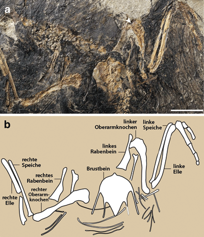 Abb. 2: Schulter und Vorderextremität von Cruralispennia multidonta. a Foto, b Strichzeichnung. Balken: 10 mm. (Aus Wang et al. 2017, verändert; CC SA 4.0)