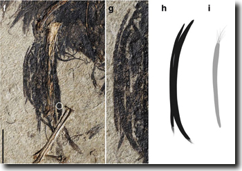 Abb. 3: Ungewöhnliche Form einiger Federn an den Schenkeln von Cruralispennia. Näheres im Text. Balken: 10 mm. (Aus Wang et al. 2017; CC SA 4.0)
