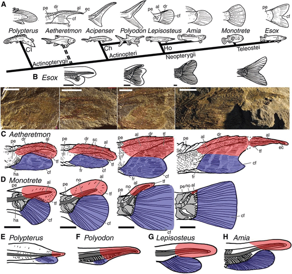 Abb. 1: Phylogenie und kaudale Ontogenese bei den Strahlenflossern. Der Vergleich ontogenetischer Stadien der Schwanzentwicklung bei heute lebenden Strahlenflossern mit fossil erhaltenen Stadien ihrer hypothetischen Vorfahren ist nahezu identisch. Die heute beobachtbare Ontogenese der Schwanzregion kann deshalb keine Rekapitulation der Phylogenese sein. Die embryonalen Anlagen und die endgültigen Schwanzflossen sind blau, während die ontogenetischen Anlagen und die endgültigen Strukturen des Schwanzes fossiler Formen als Verlängerung der Wirbelsäule und die dazugehörigen Flossen-/Dermalstrukturen rot dargestellt sind. A Hypothetische phylogenetische Abfolge der Strahlenflosser (Actinopterygii) unter Berücksichtigung der Baupläne der Schwanzregionen der jeweiligen ausgewachsenen Gattungen (Details einzelner Formen siehe auch E-H). B Ontogenetische Stadien der Entwicklung der Schwanzregion beim heute lebenden Hecht (Maßstabsbalken = 1 mm), die man als Rekapitulation interpretieren könnte. C Fossil erhaltene, embryonale und ausgewachsene Entwicklungsstadien der Schwanzregion von Aetheretmon. D Die kaudale Ontogenese des Kugelfisches Monotrete (Schwarze Skalenleisten = 0,5 mm). (Aus Sallan 2016, mit freundlicher Genehmigung)