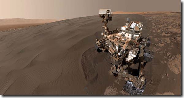 Abb. 1: Der NASA-Marsrover Curiosity bei der Arbeit auf der Marsoberfläche, „Bagnold-Dünenfeld“. Die Szene ist aus 57 Bildern zusammengesetzt, ohne Arm des Rovers. (Foto/Credit: NASA/JPL-Caltech/MSSS; 19. Januar 2016)