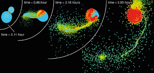 Abb. 1: Simulation eines zentralen Impakt-Vorgangs eines marsgroßen Objekts mit der Proto-Erde, der Ausbildung einer Staubwolke bis hin zur Ausprägung eines Objekts, dem Ur-Mond. (Aus Canup 2004, mit freundlicher Genehmigung)