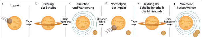 Abb. 2: Schematische Darstellung der Mondentstehung mittels eines mehrfachen Einschlagsszenarios: a Mond- bis marsgroße Körper schlagen auf der noch jungen Erde ein. b Ejekta formen eine Staubscheibe um die Erde. c Durch Gezeitenkräfte kommt es zur Akkretion kleiner Objekte, die „Moonlets“ (kleine Monde) formen, welche nach außen wandern. d Es ereignen sich weitere Einschläge. e Die Vorgänge b und c schließen sich an. d+e: Vor der nächsten Kollision erreichen die Moonlets entferntere Bahnen und machen Platz für weitere Kollisionen. f Akkretion der Moonlets zur Ausformung des Ur-Mondes. (Aus Rufu et al. 2017, mit freundlicher Genehmigung)