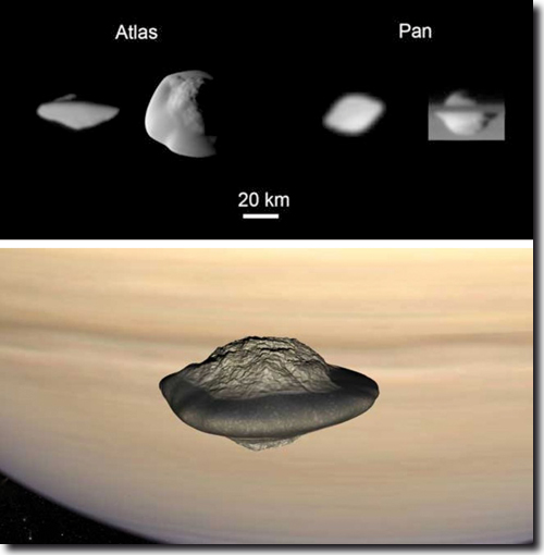 Abb. 3: Oben: Die Saturnmonde Atlas und Pan mit ihrer Aufdickung im Bereich des jeweiligen Äquators als „Fliegende Untertassen“ (http://kuffner-sternwarte.at/im_brennp/archiv2007/Saturnmonde.php) Unten: Computersimulation des Mondes Atlas (© CEA/ANIMEA; http://www.space.com/4711-flying-saucers-saturn-explained.html)