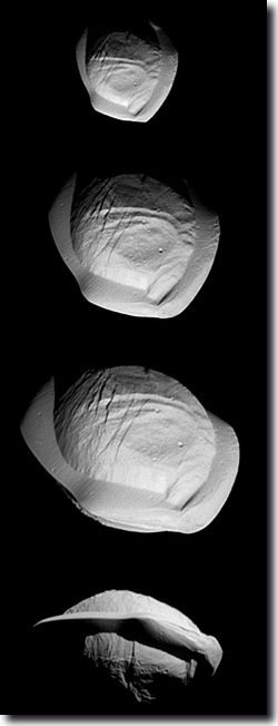 Carolyn Porco, Leiterin des Cassini-Huygens-Imaging-Teams, stellte fest, dass beide Monde leicht porös erscheinen. Zusätzlich legen Computer-Simulationen nahe, dass eine Hälfte oder vielleicht auch zwei Drittel der Monde aus Ringmaterial aufgebaut sind und der dichtere Kern aus der möglichen Zertrümmerung des erwähnten ehemals großen Mondes stammt. Dieser bereits vorhandene Kern sollte dann Staub aus dem Ringsystem aufgesammelt und zu der angedeuteten, äquatornahen Aufdickung geführt haben (Choi 2007). Abb. 4 zeigt die aktuellsten und detailliertesten Aufnahmen des Mondes Pan von Cassini-Huygens vom März 2017 aus verschiedenen Perspektiven, die das angesprochene Bild bestätigen. Ein visueller Abgleich mit der in Abb. 3 gezeigten Simulation zeigt eine bemerkenswerte Übereinstimmung – allerdings nun mit viel größerem Detail.