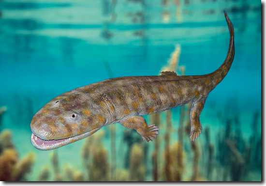 Der sogenannte „Spitzpanzer“ – Acanthostega (Abb. 1) – aus dem Oberdevon spielt eine prominente Rolle in evolutionären Hypothesen zur Entstehung der Tetrapoden (Vierbeiner) ausgehend von Fischen. Denn er lebte zwar wie Fische ausschließlich im Wasser, besaß aber Finger und damit ein typisches Vierbeiner-Merkmal.