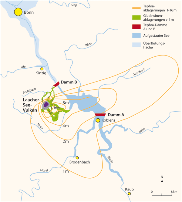 Der Hauptteil von etwa 20 km3 Tephra ist wahrscheinlich innerhalb weniger Tage aus dem Krater geschleudert worden: Asche, Lapilli, Bims (erstarrte Fetzen aufgeschäumten Magmas) sowie (Nebengesteins-) Bruchstücke von Schiefern und Sandsteinen aus dem Untergrund. Während der Hauptphase wurden Asche und Bims bis über 30 km hoch in die Stratosphäre katapultiert und über unterschiedliche Strömungssysteme sowohl weit nach Nordosten (bis Südschweden und Polen) als auch nach Süden (bis Norditalien) verfrachtet, wo ihre Niederschläge in Form dünner Lagen in See- und Moorablagerungen noch heute aufzufinden sind (Abb. 4). In Kraternähe wurde Tephra über 35 m hoch aufgeschichtet (s. Wingertsberg, Abb. 3). Der gewaltige Bims- und Ascheniederschlag erfolgte hauptsächlich östlich des Kraters; noch in einer Entfernung von 30-50 km beträgt die Mächtigkeit örtlich bis zu einem Meter. Mächtige pyroklastische Ströme (Glutlawinen), die sich radial vom Krater weg zu den jeweils topographisch tiefsten Punkten hinunterbewegten, rasten über Seitentäler (heutiges Nettetal und Brohltal) bis an und in den Rhein. In den Tälern bildeten sich so bis zu 60 m mächtige, helle und massige Ablagerungen (Ignimbrite). Am Wingertsberg (Abb. 3) zeugen die dünenartigen Strukturen der Oberen LST von hohen Transportgeschwindigkeiten; diese Base-Surge-Ablagerungen entstanden durch „sedimentgeladene Bodendruckwellen“ als unmittelbare Folge des hochexplosiven Kontaktes von Grundwasser und Magma (phreatomagmatisch).
