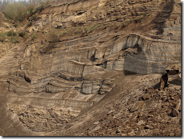 Abb. 3: Obere Laacher-See-Tephra mit dünenförmigen Bildungen (obere zwei Drittel des Ausschnittes der Tephra-Folge). Die „Dünen“ zeugen von hoher Transportgeschwindigkeit durch sogenannte Base Surges, am Boden dahin schießende Druckwellen (Schmincke 1970); sie bestanden aus einem Gemenge aus Lapilli, Bruchstücken des Untergrundgesteins und Dampf. Ihre hohe Energie entstand durch Magma-Wasser(dampf)-Explosionen. Wingertsberg, ca. 1 km S Laacher See, Transportrichtung von links nach rechts. Foto: M. Kotulla, 2008.