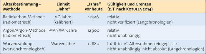 Tab. 1: Angewandte Altersbestimmungsmethoden zur „Datierung“ der Laacher-See-Eruption. Die übereinstimmenden Ergebnisse – etwa 12 900 Jahre vor heute – (hier ohne Fehlergrenzen) vermitteln eine gesicherte Bestimmung. Dies ist aber – mit Blick auf die Gültigkeit der jeweiligen Methode und der Abhängigkeit der Ergebnisse – nicht der Fall (siehe Textteil).