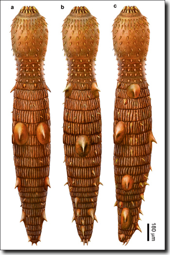 Abb. 1: Rekonstruktion des Hakenrüsslers Eokinorhynchus rarus von verschiedenen Seiten. (Künstlerische Darstellung von Dinghua Yang, Nanjing Institute of Geology and Palaeontology; aus Zhang et al. 2015, Creative commons licence)