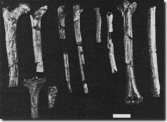 Abb. 1: Langknochen von OH 62 (Homo hablilis) im Vergleich mit entsprechenden Elementen von AL 288-1 (Australopithecus afarensis); die Knochen von OH 62 sind jeweils rechts. Balken: 4 cm. (Aus Johanson et al. 1987)