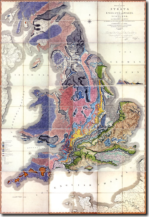 Abb. 3: Bereits 1815 legte der Ingenieur William Smith (1769-1839) eine erste flächendeckende geologische Karte von England, Wales und Teilen Schottlands vor. Die geschätzte Auflage von etwa 400 Exemplaren wurde über einen Zeitraum von zwei Jahren handkoloriert. Die Karte besteht aus 15 Blättern und hat eine zusammengesetzte Größe von ca. 1,8 x 2,5 m. (Freundliche Zurverfügungstellung: cartographia.wordpress.com)
