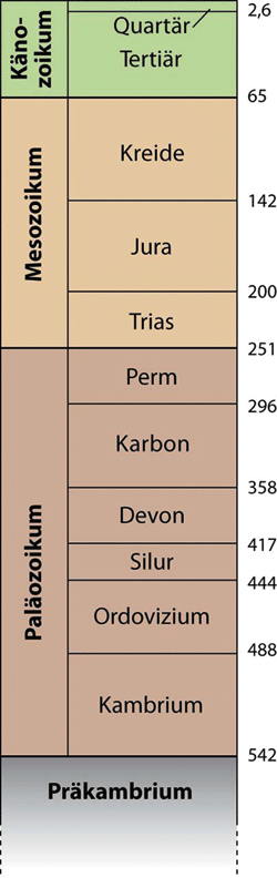 Abb. 4: Geologische Zeitskala, schematisch nach GTS2004 (Gradstein et al. 2004). Zahlenwerte: Millionen [radiometrische] Jahre; Grafik aus Junker & Scherer (2013).