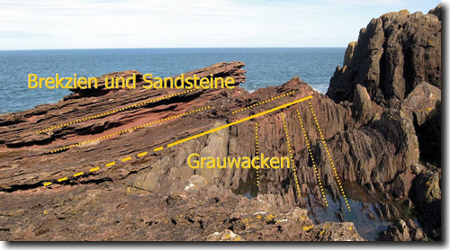 Die anstehenden Ablagerungen allerdings lassen eine derartige Interpretation nicht zu. Vielmehr bezeugen die Sedimentgesteine eine sehr rasche Erosion und Sedimentation (s. Kotulla 2014a, 2-20; Abb. 7 oben): Die steilstehenden, schlecht sortierten (silurischen) Grauwacken (Sandsteine), die mit Tonschiefern alternieren, werden heute als Ablagerungen von Trübeströmen an untermeerischen Hängen gedeutet; eine Grauwacken-Sequenz repräsentiert ein kurzzeitiges Ereignis und entstand möglicherweise innerhalb von Minuten. Der überlagernde, flach geneigte rötliche Gesteinskomplex, devonische Old-Red-Sandsteine, besteht aus einer basalen Brekzie und sich anschließenden Sandsteinen mit Kreuzschichtung sowie eingelagerter Brekzienhorizonte. Sie werden als rasche Ablagerung schnell fließender Oberflächenströme interpretiert.