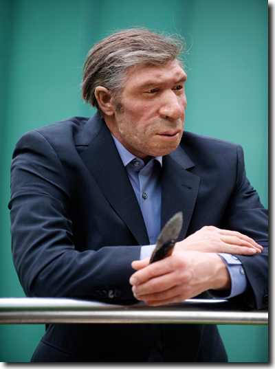 Abb. 8: Der Neandertaler – nicht der erste Mensch. Er bildet einen Baustein in der Rekonstruktion der Menschheitsgeschichte. Unser Erkenntnisgewinn über den Neandertaler in einem Zeitraum von etwa 150 Jahren ist elementar: vom „affigen, primitiven Menschen“ (frühe Nachbildungen) zum „strategischen Manager“ (moderne Nachbildung). (Foto: Neanderthal Museum Mettmann, freundliche Zurverfügungstellung)
