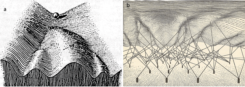 Abb. 1: a Modell einer Entwicklungslandschaft; b Blick hinter die Kulissen: die Landschaft wird durch ein komplexes Netzwerk gestaltet. (Nach Waddington 1957, 29 und 36)