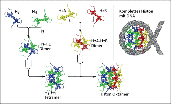 Histone sind Proteine, mit deren Hilfe die DNA im Zellkern platzsparend aufgewickelt und verpackt wird (Abb. 5). Bestimmte Aminosäuren der Histone – vor allem am Anfang und am Ende der jeweiligen Eiweißkette – können durch Anfügen von verschiedenen chemischen Gruppen modifiziert werden (z. B. Methyl-, Acetyl-, Phosphat- oder andere Gruppen). Dadurch wird die Verpackungsdichte der DNA in diesem Bereich verändert und damit auch deren Zugänglichkeit für weitere Prozesse. Die DNA muss für die Verarbeitung der darin enthaltenen Information z. B. mit weiteren Proteinen in Kontakt treten können, deren Zugang durch die veränderte Verpackung ggf. erschwert ist. Diese Veränderung in der Zugänglichkeit der DNA wirkt epigenetisch.
