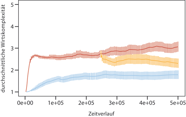 Wie aus dem Graphen ersichtlich ist, nahm die Komplexität in allen Durchläufen zu. Die Komplexitätszunahme ohne Parasiten ist dabei aber klein genug, dass sie mit stochastischen Prozessen erklärt werden kann. Waren Parasiten anwesend, stieg die Komplexität jedoch signifikant stärker an. Es ist also ersichtlich, dass antagonistische Koevolution, zumindest in diesem System, zu einer verstärkten Evolution führt.