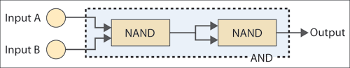 NAND und NOR („not OR“) werden logisch vollständig genannt. Das bedeutet, dass sie benutzt werden können, um jede der anderen Funktionen zu formen. Untenstehend eine AND-Funktion, die aus NAND-Bausteinen besteht: