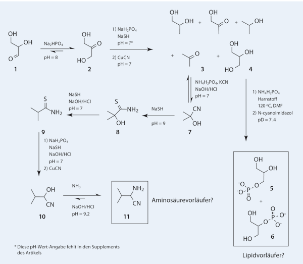 Im Zentrum der aktuellen Arbeit (Patel et al. 2015) steht die Umsetzung von Glycerinaldehyd (1 in Abb. 1) zu Dihydroxyaceton (2). Diese ist bei leicht basischem pH-Wert thermodynamisch begünstigt. Ausgehend von 2 stellen die Autoren ein Reaktionsnetzwerk vor, bei dem verschiedene Aminosäurevorläufer und Lipidvorläufer synthetisiert werden. Bei den vorgeschlagenen Lipidvorläufern handelt es sich um Glycerolphosphate (5 und 6). In Lipiden, die am Aufbau von Zellmembranen beteiligt sind, sind ähnliche Moleküle mit Fettsäuren verestert. Für die Funktion von Lipiden in Zellmembranen ist ihr ampiphiler Charakter entscheidend, d. h. sie „lieben“ sowohl Wasser als auch wasserabweisende Öl-artige Medien. Fettsäuren könnten diese Funktion prinzipiell erfüllen, aber Glycerolphosphate nicht. Glycerolphosphate erscheinen in diesem Licht eher überflüssig und bringen keinen Fortschritt für die Erklärung der Herkunft einfacher amphihiler Moleküle wie Alkylphosphate, Alkylsulfate oder Fettsäuren (Ruiz-Mirazo et al. 2014). Die Einschätzung von Glycerolphosphaten als Lipidvorläufer ist zwar sachlich nicht falsch, ein entscheidender Teil fehlt jedoch (die lipophile Kette) und derzeit gibt es auch keine Ansatzpunkte in Sutherlands Chemie, die eine Entstehung langer Alkylketten plausibel machen könnten. Für Moleküle mit amphiphilen Eigenschaften sind diese Ketten aber unbedingt notwendig.