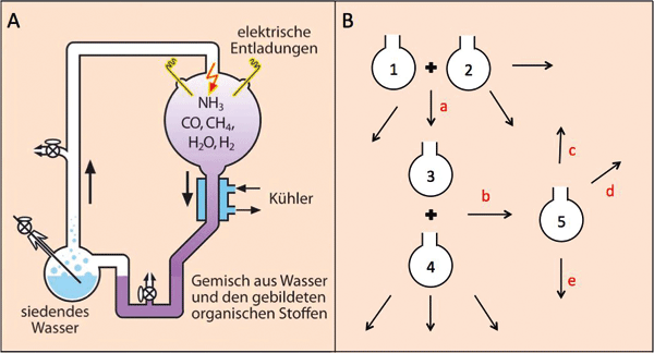 Für Szenarien der präbiotischen Chemie, also chemischer Synthesen, die zur Erzeugung von Stoffen zum Aufbau erster lebender Systeme genutzt werden können, ist die Konzeption möglichst einfacher und vor allem einheitlicher Reaktionsbedingungen erforderlich („Eintopfreaktionen“). Komplizierte Mechanismen, räumliche Trennungen und passende Abfolgen sind ohne Planung und Vorüberlegung wenig plausibel. Daher sind für die präbiotische Chemie Eintopfreaktionen viel wahrscheinlicher und einfacher zu begründen als komplexe, räumlich abgetrennte Reaktionen, deren Produkte zunächst in Isolation angereichert werden müssen und dann unter anderen Reaktionsbedingungen mit Stoffen weiter reagieren, die wiederum unter anderen speziellen Bedingungen erzeugt worden sind. Ein klassisches Beispiel für einen präbiotischen Eintopfversuch ist das bekannte Simulationsexperiment von Miller und Urey (Abb. 2A).