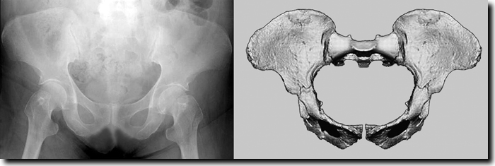 Abb. 2: Links: Röntgenbild des Beckens eines Menschen mit Down-Syndrom (mit freundlicher Genehmigung von LearningRadiology.com). Rechts: Becken von Australopithecus africanus (Stw 14) (aus Kibii et al. 2011). Das Becken des Flores-Menschen (siehe Abb. 1) ähnelt mit den seitlich ausladenden Darmbeinschaufeln („flaring ilia“) dem Becken von Menschen mit Down-Syndrom und dem Becken von Australopithecinen (siehe auch Fußnote 1).