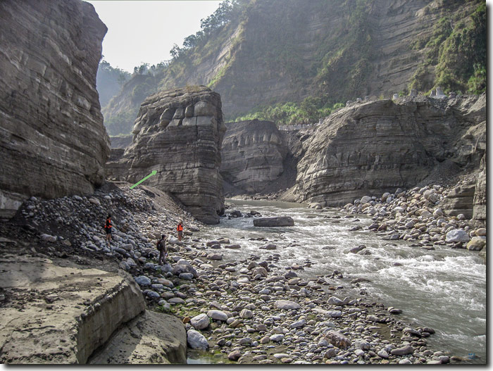 Abb. 1: Schlucht des Da’an Chi (Taiwan), gegenwärtig knapp 1 km lang, 25 m breit und bis zu 20 m tief. Die Schlucht bildete sich nach dem Jiji-Erdbeben (1999) hauptsächlich in den Jahren 2004-2008. Der große Felssporn in der Bildmitte (grüner Pfeil) wurde während eines Hochwassers im Juni 2012 binnen einer Stunde weggespült (BBC). Zur Erosion siehe Textteil. Foto: Kristen Cook (freundliche Zurverfügungstellung, GFZ-Pressestelle), siehe auch BBC-Video über eines der heftigeren Flutereignisse (Link am Textende).
