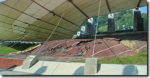 Abb. 2: Verwerfung auf dem Sportgelände der ehemaligen Guangfu Junior High School in Wufeng (Taiwan). Die etwa 2 m hohe Steilstufe – hier schräg zur 400-Meter-Laufbahn verlaufend – entstand bei dem Jiji-Erdbeben am 21. September 1999 (Magnitude M 7,6). Foto: Iv0202 (Wikimedia Commons), 921 Earthquake Museum of Taiwan.