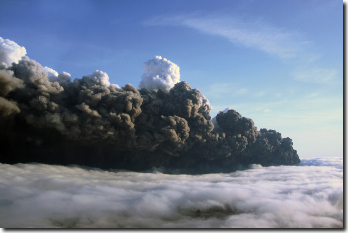 Abb. 1: Der explosive Ausbruch des Eyjafjallajökull am 14. April 2010. Die Aschepartikel in der Troposphäre brachten den europäischen Flugverkehr für Tage zum Erliegen. Foto: Thorsten Boeckel (freundliche Zurverfügungstellung); Aufnahme um 16:08 Uhr Ortszeit aus nördlicher Richtung in etwa 2.000 m Höhe.