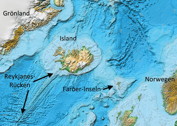 Abb. 2: Bathymetrische und (Relief-) Karte des Nordatlantik zwischen Grönland und Norwegen. Im Zentrum liegt Island. Die isländische Plattform umfasst zusätzlich den Island umgebenden Schelfbereich; er bildet einen scharfen Rand. In einer WNW-OSO-Achse bestehen allerdings zwei Kontakte der isländischen Plattform zur Umgebung: Zum Schelfbereich Grönlands und zum südwestlich gelegenen Plateau der Faröer-Inseln. Bild: http://ngdc.noaa.gov; Einfügungen durch den Verfasser.