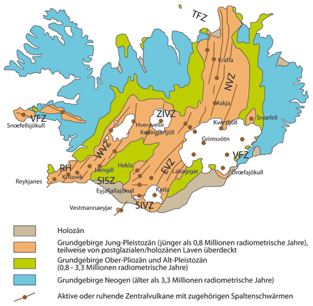 Abb. 3: Vereinfachte geologische Karte Islands. Die Formationen werden beidseits vom Rand zur Mitte hin jünger. Der sich von Norden nach Süden bzw. Südwesten aufspaltende Bereich des jungpleistozänen Grundgebirges (rote Farbe) deckt sich im Wesentlichen mit dem gegenwärtigen vulkano-tektonisch aktiven System Islands. Diese 50-150 km breite Zone ist der deformierte Grenzbereich zweier großer divergierender tektonischer Platten, der nordamerikanischen und eurasischen (siehe auch Abb. 10). Karte modifiziert nach Jóhannesson & Saemundsson (1998) sowie T. Weissenberger4. Zonengliederung und -charakterisierung siehe Textteil; VFZ: Vulkanische Flankenzone, RH: Reykjanes-Halbinsel, SISZ: Südisländische Seismische Zone, WVZ: Westliche Vulkanische Zone, ZIVZ: Zentralisländische Vulkanische Zone, NVZ: Nördliche Vulkanische Zone, TFZ: Tjörnes Bruchzone, EVZ: Östliche Vulkanische Zone, SIVZ: Südisländische Vulkanische Zone.