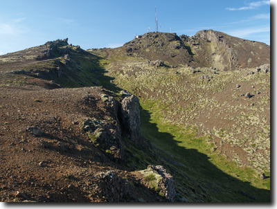 Abb. 4: Thorbjarnarfell (243 m), Reykjanes-Halbinsel, nahe der Blauen Lagune. Der durch eine subglaziale vulkanische (Spalten-) Eruption im Pleistozän entstandene Bergrücken besteht hauptsächlich aus Hyaloklastiten. Die Spalten dominieren die Struktur des frei stehenden Berges mit einer Grundfläche von etwa 1,2 x 1,8 km (Fortsetzung im Untergrund nicht bekannt). Zum Vergleich: Die subglaziale Gjálp-Eruption 1996 dauerte 13 Tage und bildete einen Hyaloklastit-Rücken von 6-7 km Länge und 200-300 m Höhe unter einer 500-750 m dicken Eisbedeckung (Gudmundsson et al. 1997). Foto: M. Kotulla (17. 8. 2014), Richtung SW.