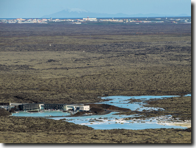 Abb. 5: Das Nützliche mit dem Angenehmen verbinden. Das Thermalfreibad Blaue Lagune auf der Reykjanes-Halbinsel unmittelbar neben dem Geothermalkraftwerk Svartsengi (östlich, nicht im Bild), vom nahegelegenen Thorbjarnarfell (Abb. 3) aus gesehen. Das Bad befindet sich in einem im Jahre 1226 entstandenen Lavafeld. Im Hintergrund der 12 km entfernte Flughafen Keflavik. Der Flughafen liegt – (platten)tektonisch betrachtet – auf der nordamerikanischen Platte, während das Lavafeld in der vulkanisch aktiven Grenzzone zwischen den Platten liegt. Am Horizont noch zu erkennen ist der 120 km entfernte schnee- und eisbedeckte Snæfellsnes-Vulkan. Foto: M. Kotulla (17. 8. 2014), Richtung NW.
